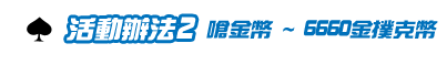 本活動贈送之6660枚金撲克幣為遊戲虛擬寶物,將於1/18系統維修後;統一發送至符合贈獎資格之玩家帳號內。 ※ 96/1/11戲谷進行系統更新與機器升級,該日應發送之虛寶(含公會戰、戰利區獎勵)將延後至1/18進行發放。